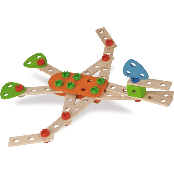 EICHHORN Constructor 85-delig Bouw met de 85-delige Eichhorn Constructor set een cool model. Met behulp van het meegleverde gereedschap, de handleiding en de schroeven worden de 85 houten delen en verbindingselementen met elkaar verbonden en er ontstaat een voertuig. Het samenbouwen bevordert het ruimtelijk denken en de fijne motoriek. De modelvarianten bij deze set: Pterosauriërs, dubbeldekker, motor of waterhelikopters. Geschikt voor kinderen vanaf 4 jaar. Voor de productie van de Eichhorn wordt uitsluitend FSC ® 100% hout van duurzame bosbouw gebruikt.