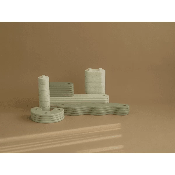 - Er zijn in totaal vier soorten balken: lange rechte, korte rechte, lange gebogen en gebogen, en twee soorten verbindingsstukken die op elkaar kunnen worden gestapeld voor meer hoogte en uitdaging.