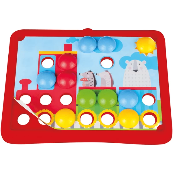 LENA ® My First Mosaic Traffic, bestaande uit een kunststof pegboard met afgeronde hoeken, grote knijpers en 7 stevige papieren sjablonen. Het spel bevordert de hand-oog coördinatie en stimuleert de visuele waarneming.