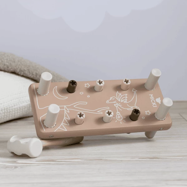 - Micki s populaire houten speelplank met hamer is een klassiek houten speelgoed dat zowel het speelinstinct stimuleert als de fijne motoriek van het kind traint.