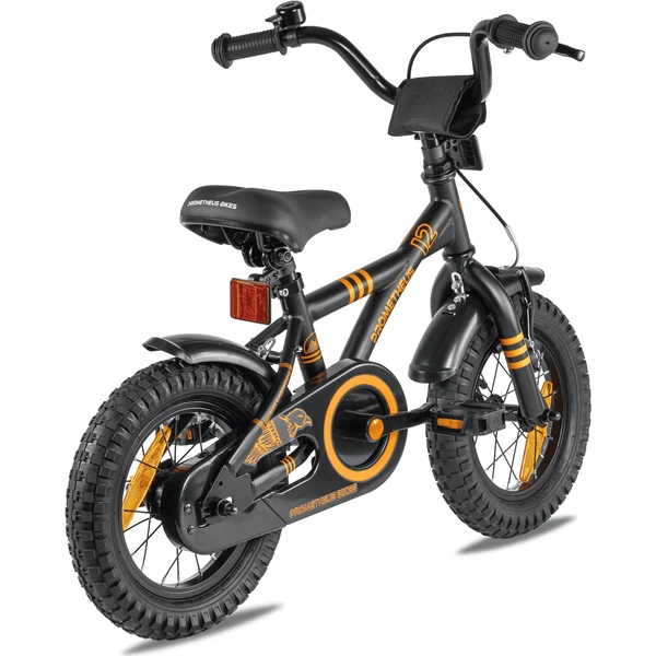 PROMETHEUS VEILIGHEIDSPAKKET: met aluminium bel, stuurbeschermers, handgrepen, reflecterende antislip Pedal e, kettingkast, spatborden, mand, afneembare zijwieltjes en extra grote reflectoren rondom de kinderfiets.