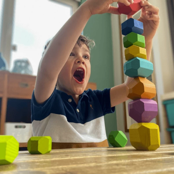 - Kinderen hebben de beste ideeën over wat ze kunnen bouwen met de houten balanceerstenen, stapelen is maar één variatie