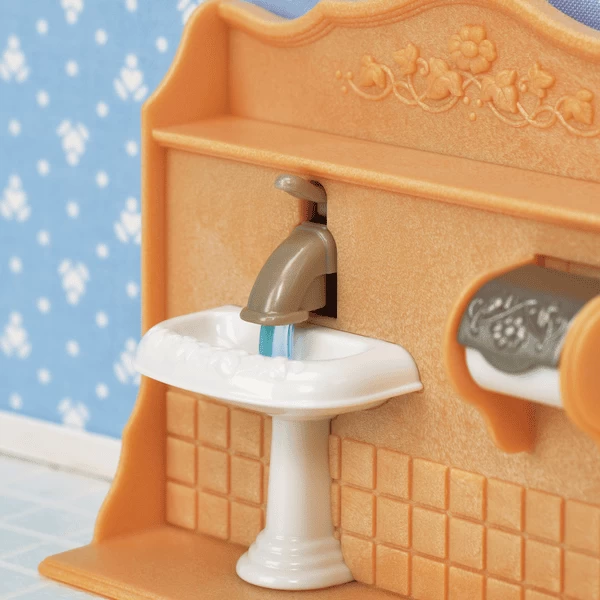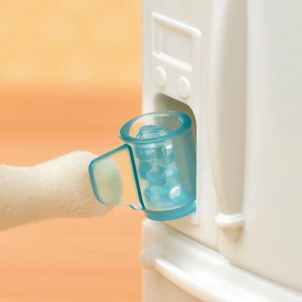 De koelkast heeft een deur en een lade om te openen en een ijsblokjesmachine. Als je de beker in het ijsblokjescompartiment drukt, vallen er kleine ijsblokjes in de beker. Het fornuis heeft een ovendeur die geopend kan worden en een gasfornuis. Als je aan de knop draait, komen er kleine vlammen uit de kookplaat. Op de vaatwasser staat een werkblad waar je met een mes een taart kunt snijden. In de gootsteen stroomt het water uit de kraan als u de hendel omhoog trekt en in het toilet komt er ook water uit als u doorspoelt.