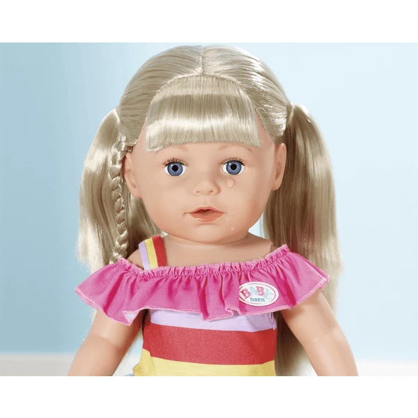 BABY born vindt de roze en paarse lokken bijzonder chic en wil ze altijd uit het haar van Zus trekken. Dan kunnen de poppen tranen van grote zus vloeien. Maar alleen als ze eerst water uit haar fles heeft gedronken.
